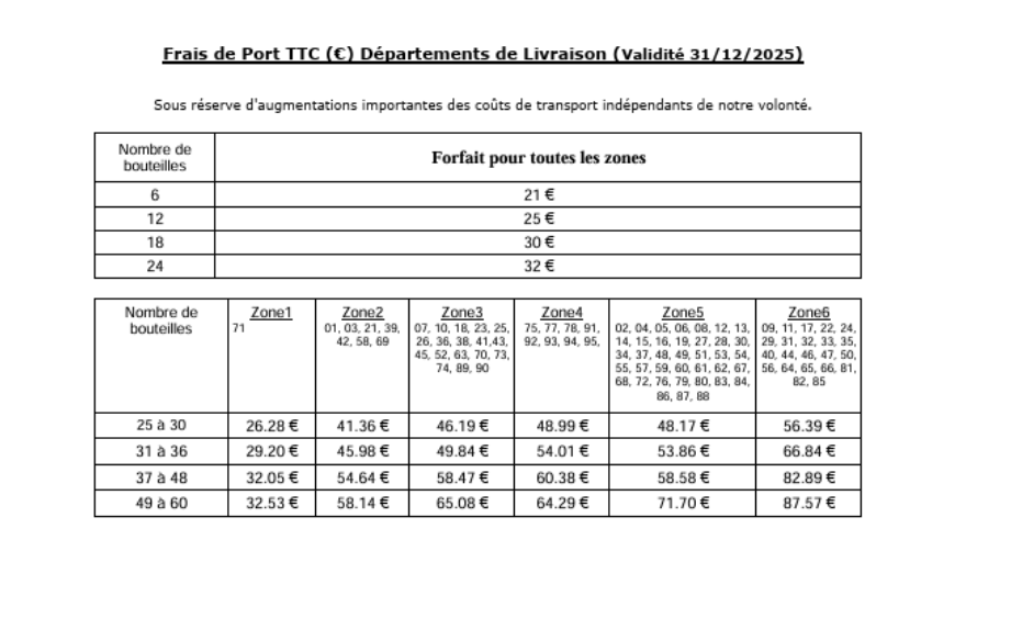 Les vins sont vendus par multiples de 6 bouteilles (cartons complets de 75cl) ou par 3 unités pour les formats magnums, sauf indication contraire.